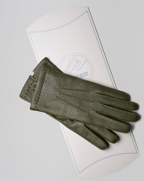 Experience the unparalleled artistry of Thomas Riemer with these Loden Green colored gloves, crafted from Peccary leather with cashmere lining. Indulge in the softness and resilience of this rare leather, sourced sustainably from South America. Thomas Riemer Gloves are designed to mold to your hands, ensuring unmatched comfort and style. These gloves offer a perfect balance of elegance and functionality. Embrace the legacy of fine glove-making with this timeless addition to your wardrobe.